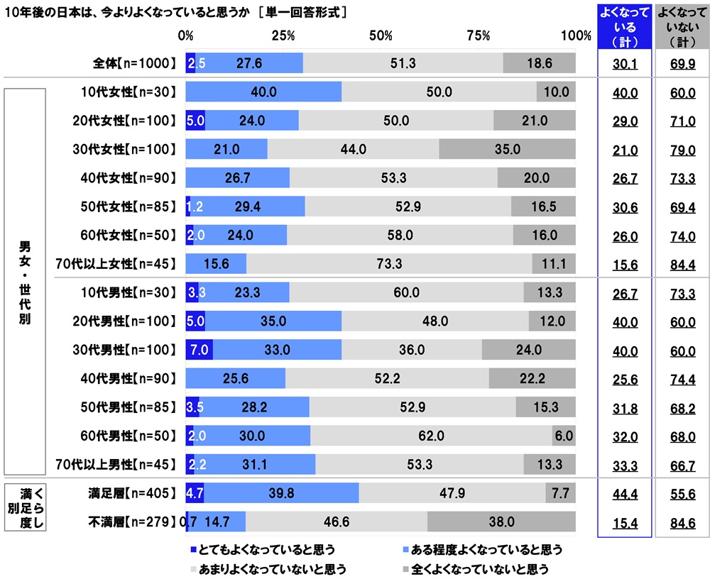 全回答者(1,000名)に、10年後の日本は、今よりよくなっていると思うか聞いたところ、「とてもよくなっていると思う」が2.5%、「ある程度よくなっていると思う」が27.6%で、合計した「よくなっている(計)」が30.1%、「全くよくなっていないと思う」が18.6%、「あまりよくなっていないと思う」が51.3%で、合計した「よくなっていない(計)」が69.9%となり、過半数が日本の将来に不安を感じている結果となりました。