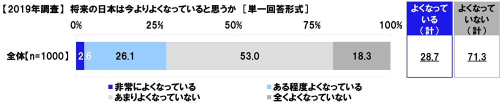 2019年の調査結果では、将来の日本は今よりよくなっていると思うか聞いたところ、「よくなっている(計)」(「非常に」と「ある程度」の合計)は28.7%、「よくなっていない(計)」(「全く」と「あまり」の合計)は71.3%でした。