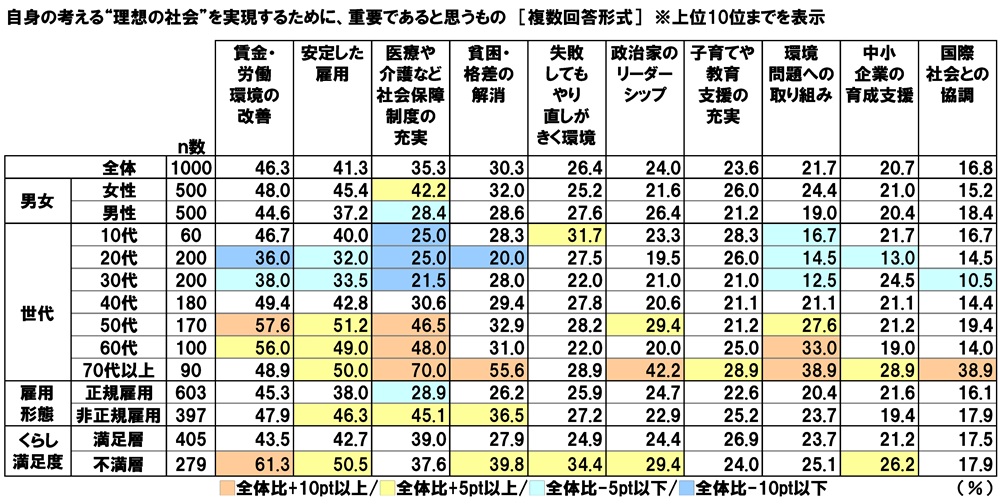 全回答者(1,000名)に、自身の考える“理想の社会”を実現するために、重要であると思うものを聞いたところ、1位「賃金・労働環境の改善」(46.3%)、2位「安定した雇用」(41.3%)となりました。働き方について、条件や安定性の向上を求める人が多いようです。以降、3位「医療や介護など社会保障制度の充実」(35.3%)、4位「貧困・格差の解消」(30.3%)、5位「失敗してもやり直しがきく環境」(26.4%)でした。