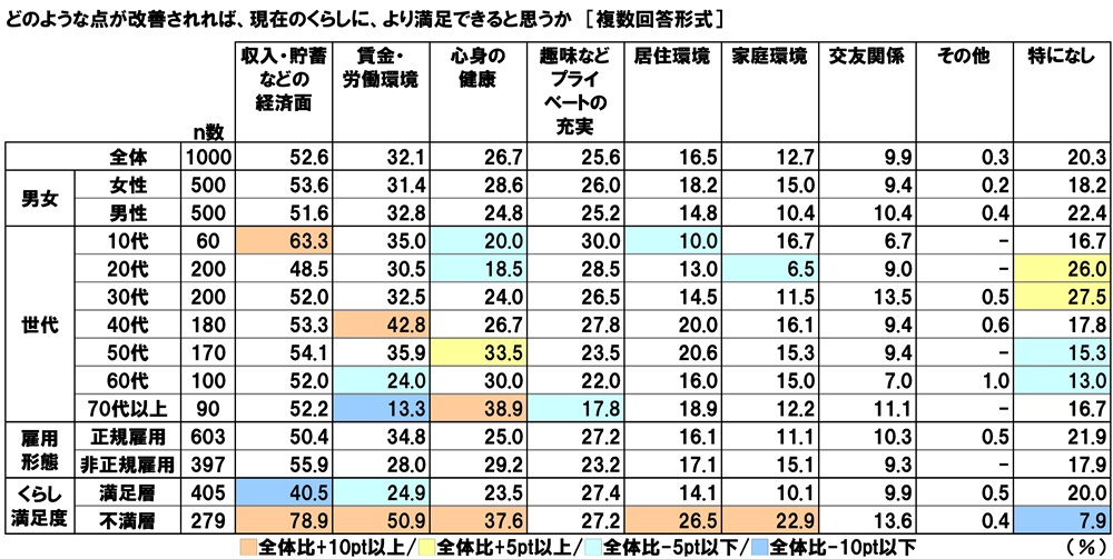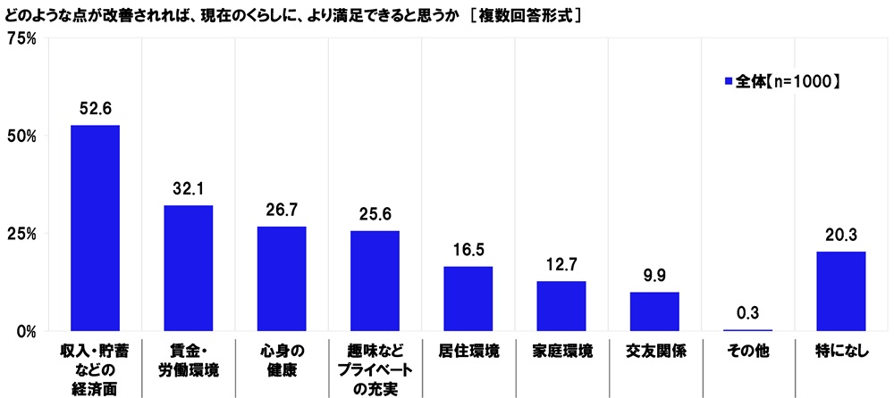 次に、どのような点が改善されれば、現在のくらしに、より満足できると思うか聞いたところ、最も高くなったのは「収入・貯蓄などの経済面」(52.6%)で、半数以上となりました。次いで、「賃金・労働環境」(32.1%)、「心身の健康」(26.7%)、「趣味などプライベートの充実」(25.6%)、「居住環境」(16.5%)となりました。