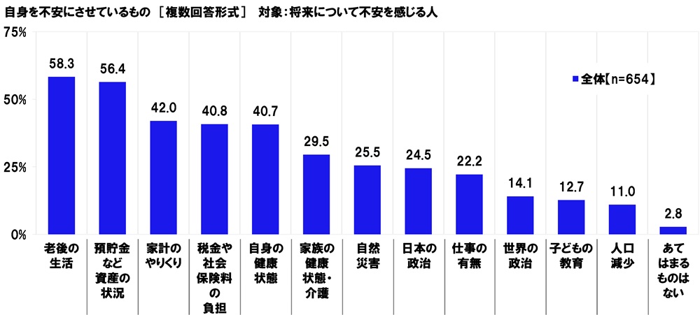 将来について不安を感じる人(654名)に、自身を不安にさせているものを聞いたところ、「老後の生活」(58.3%)と「預貯金など資産の状況」(56.4%)が半数以上となりました。将来の生活資金に対し不安を抱いている人が多いのではないでしょうか。以降、「家計のやりくり」(42.0%)、「税金や社会保険料の負担」(40.8%)、「自身の健康状態」(40.7%)となりました。