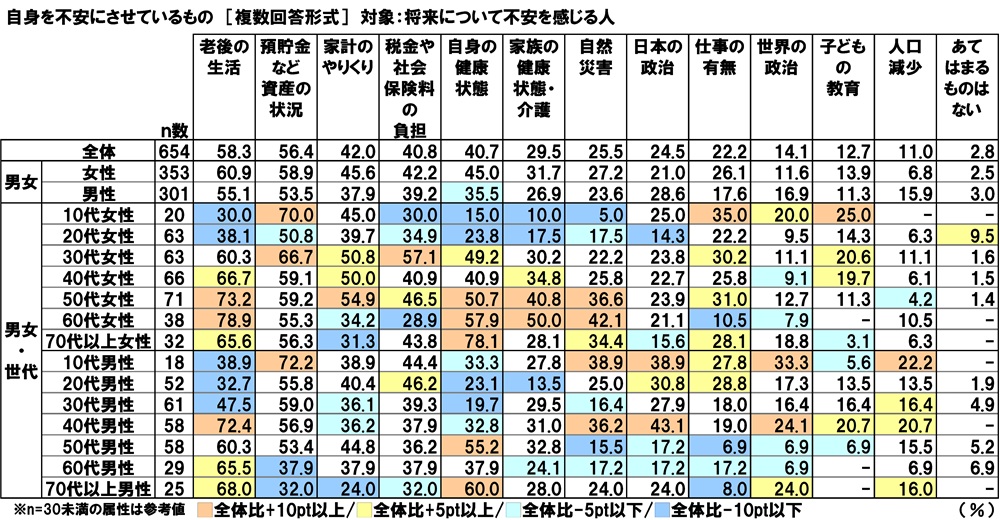 男女・世代別にみると、「老後の生活」は50代女性(73.2%)、60代女性(78.9%)、40代男性(72.4%)では7割を超えました。また、男女ともに、20代、30代では「預貯金など資産の状況」(20代女性50.8%、30代女性66.7%、20代男性55.8%、30代男性59.0%)が最も高くなりました。