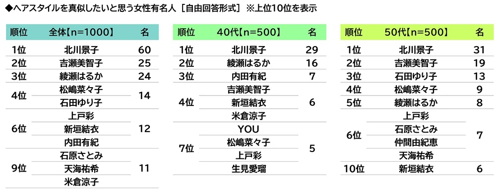 回答者の年代別にみると、40代回答者では1位「北川景子さん」(29名)、2位「綾瀬はるかさん」(16名)、3位「内田有紀さん」(7名)、50代回答者では1位「北川景子さん」(31名)、2位「吉瀬美智子さん」(19名)、3位「石田ゆり子さん」(13名)となりました。