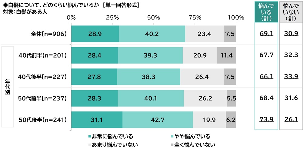 白髪がある人(906名)に、白髪について、どのくらい悩んでいるか聞いたところ、「非常に悩んでいる」が28.9%、「やや悩んでいる」が40.2%で、『悩んでいる(計)』は69.1%、「全く悩んでいない」が7.5%、「あまり悩んでいない」が23.4%で、『悩んでいない(計)』は30.9%となりました。白髪の存在が気になっていたり悩みのタネになっていたりする人が多いようです。