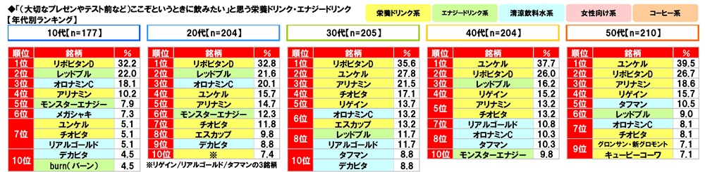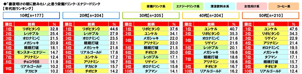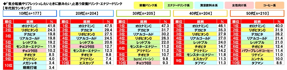 年代別ランキングでは、「レッドブル」(10代、20代では2位であるが50代ではトップ10のランク外)や「ユンケル」(30代で2位、40代、50代では1位であるが、10代ではランク外)のように、世代によって順位が大きく異なる銘柄がみられた一方、「リポビタンD」(10代、20代、30代で1位、40代、50代で2位)のように幅広い世代から支持されている銘柄もあった。
