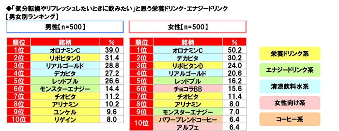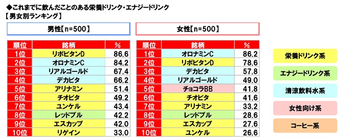 男女別にみると、男性では、1位「リポビタンD」、2位「オロナミンC」、3位「リアルゴールド」、女性では、1位「オロナミンC」、2位「リポビタンD」、3位「デカビタ」となり、5位には「チョコラBB」が入った。