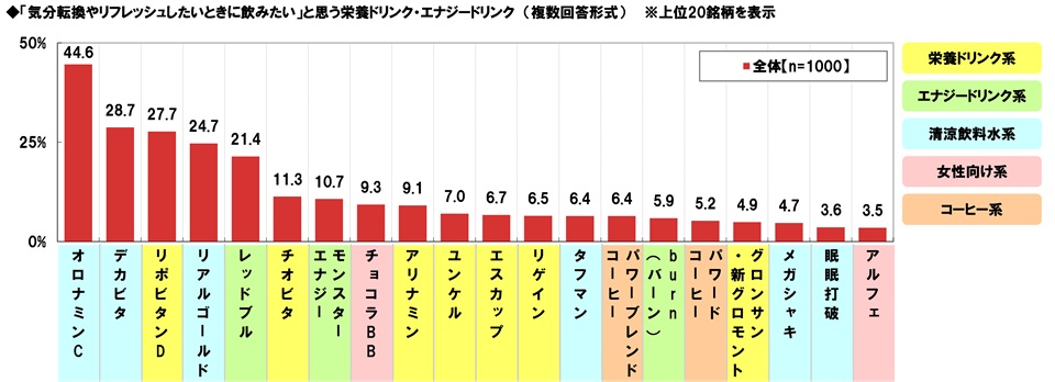 次に、≪気分転換やリフレッシュしたいとき≫に飲みたいものでは、1位「オロナミンC」、2位「デカビタ」、3位「リポビタンD」、4位「リアルゴールド」、5位「レッドブル」となった。≪徹夜明けの朝≫とは異なり、1位(オロナミンC)、2位(デカビタ)は、どちらも清涼飲料水系の銘柄となり、4位の「リアルゴールド」も含めると、上位5銘柄中3銘柄が清涼飲料水系の商品となった。