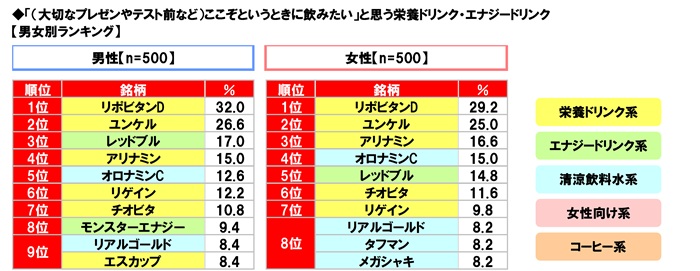 そして、≪(大切なプレゼンやテスト前など)ここぞというとき≫に飲みたいものでは、「リポビタンD」が1位となり、2位「ユンケル」、3位「レッドブル」、4位「アリナミン」、5位「オロナミンC」が続いた。1位(リポビタンD)、2位(ユンケル)、4位(アリナミン)と、上位5銘柄中3銘柄が栄養ドリンク系となった。また、3位にはエナジードリンク系の「レッドブル」が入った。