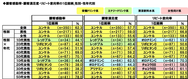 女性に限った場合においても、≪顧客感動率≫、≪顧客満足度≫、≪リピート意向率≫の1位は「ユンケル」(顧客感動率60.9%、顧客満足度55.6%、リピート意向率58.6%)であったが、年代別にみていくと、≪顧客感動率≫では10代女性の1位は「レッドブル」(44.4%)となり、≪顧客満足度≫では10代女性と20代女性の1位は「オロナミンC」(それぞれ62.5%、44.3%)、≪リピート意向率≫では20代女性と30代女性の1位は「チョコラBB」(それぞれ58.5%、61.1%)となった。