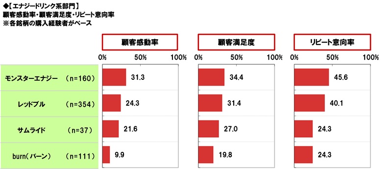 また、3つの評価について、エナジードリンク系に絞ってみてみると、いずれの評価でも1位は「モンスターエナジー」(顧客感動率31.3%、顧客満足度34.4%、リピート意向率45.6%、以下同順)、2位「レッドブル」(24.3%、31.4%、40.1%)となった。