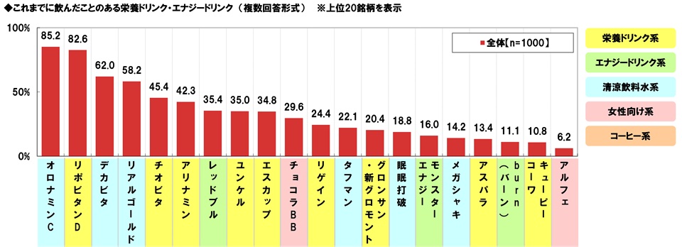 全回答者(1,000名)に、これまでに飲んだことのある銘柄を聞いたところ、「オロナミンC」85.2%が最も多く、僅差で「リポビタンD」82.6%、さらに、「デカビタ」62.0%、「リアルゴールド」58.2%、「チオビタ」45.4%、「アリナミン」42.3%が続いた。日本での販売歴の長さからか上位5銘柄は“清涼飲料水系”と“栄養ドリンク系”が占めた。