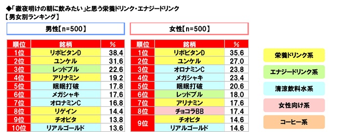まず、≪徹夜明けの朝≫に飲みたいものでは、1位「リポビタンD」、2位「ユンケル」、3位「メガシャキ」、4位「レッドブル」、「オロナミンC」となった。1位(リポビタンD)、2位(ユンケル)はどちらも栄養ドリンク系の商品であったが、3位には“眠気スッキリ”を謳い文句にしている清涼飲料水系の「メガシャキ」、4位にはエナジードリンク系の「レッドブル」が入った。