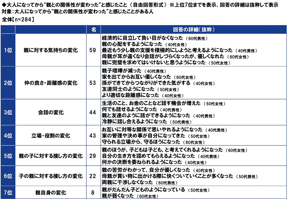 回答の詳細をみると、「親子喧嘩が減った(40代男性)」、「家の管理や決め事が自分になってきた(50代女性)」、「守られる立場から、守るほうになった(60代女性)」、「自分の生き方を認めてもらえるようになった(40代男性)」、「何かの決断を委ねられるようになった(40代女性)」、「親の苦労がわかって、自分が優しくなった(40代女性)」といった回答がみられました。距離ができたことでお互いに客観視できるようになったり、同じ親の立場になって理解が深まったりすることで親子間の関係性が変わったことを実感することが多いようです。
