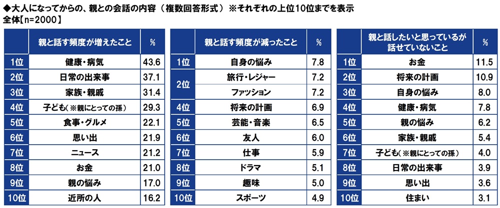 大人になってから親と話す頻度が増えたこと 1位「健康・病気」2位「日常の出来事」3位「家族・親戚」
