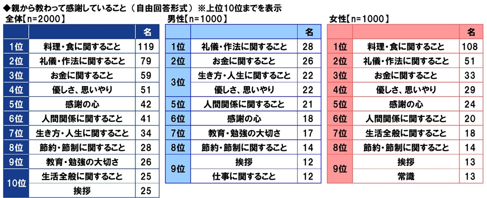 男女別にみると、男性では1位「礼儀・作法に関すること」、2位「お金に関すること」、3位「生き方・人生に関すること」「優しさ、思いやり」となり、女性では1位「料理・食に関すること」、2位「礼儀・作法に関すること」、3位「お金に関すること」、4位「優しさ、思いやり」、5位「感謝の心」でした。「料理・食に関すること」は、女性ではダントツとなった一方、男性ではTOP10にランクインしませんでした。