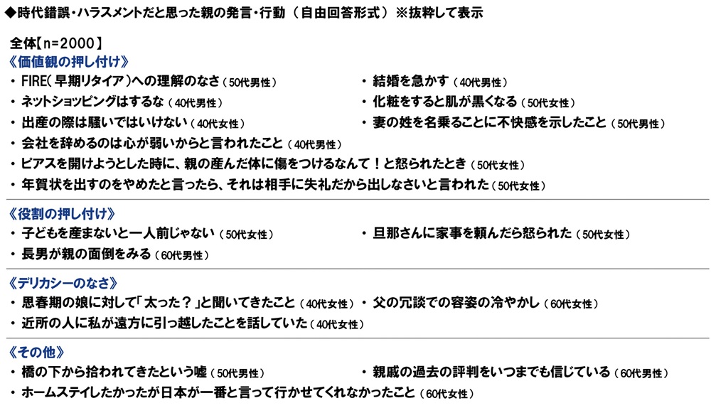 全回答者(2,000名)に、時代錯誤・ハラスメントだと思った親の発言・行動を聞いたところ、「妻の姓を名乗ることに不快感を示したこと(50代男性)」、「会社を辞めるのは心が弱いからと言われたこと(40代男性)」、「ピアスを開けようとした時に、親の産んだ体に傷をつけるなんて!と怒られたとき(50代女性)」といった価値観を押し付けるような言動が多くみられました。