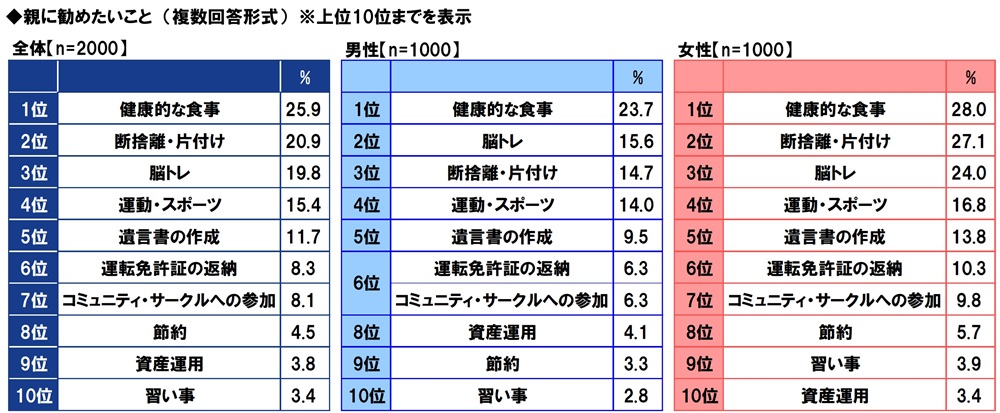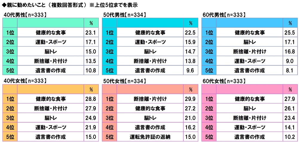 親に勧めたいこと 1位「健康的な食事」2位「断捨離・片付け」3位「脳トレ」