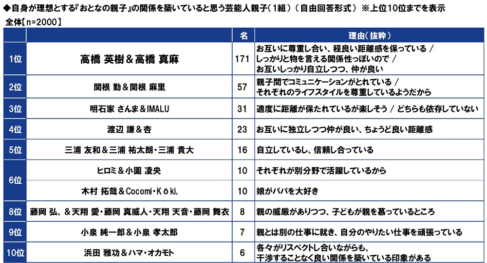 全回答者(2,000名)に、自身が理想とする『おとなの親子』の関係を築いていると思う芸能人親子(1組)を聞いたところ「高橋 英樹さん&高橋 真麻さん」が1位となり、次いで、2位「関根 勤さん&関根 麻里さん」、3位「明石家 さんまさん&IMALUさん」、4位「渡辺 謙さん&杏さん」、5位「三浦 友和さん&三浦 祐太朗さん・三浦 貴大さん」となりました。