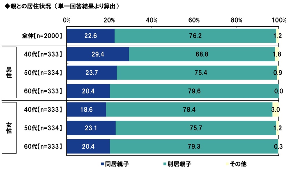 全回答者(2,000名)に、親との居住状況を聞いたところ、「同居親子」は22.6%、「別居親子」は76.2%、「その他」は1.2%でした(※)。
