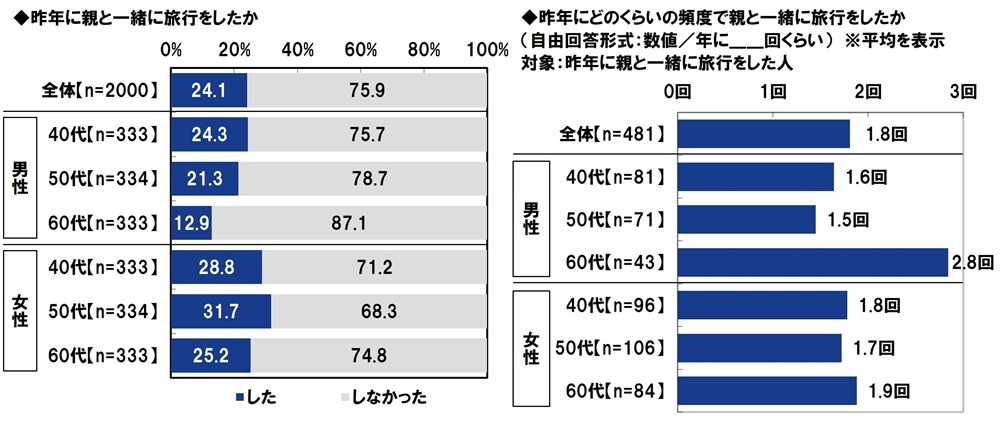 昨年に親と一緒に旅行をした人(481名)に、どのくらいの頻度で旅行をしたか聞いたところ、平均は1.8回となりました。また、最も回数が多かった回答は30回でした。
