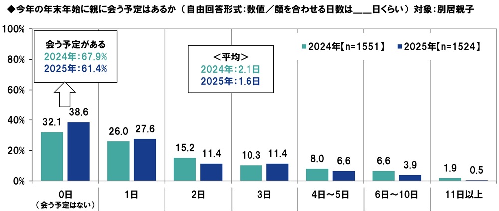 別居親子(1,524名)に、今年の年末年始に親に会う予定はあるかを聞いたところ、「会う予定はない」は38.6%となり、会う予定がある人の割合は61.4%、顔を合わせる予定の日数の平均は1.6日でした。