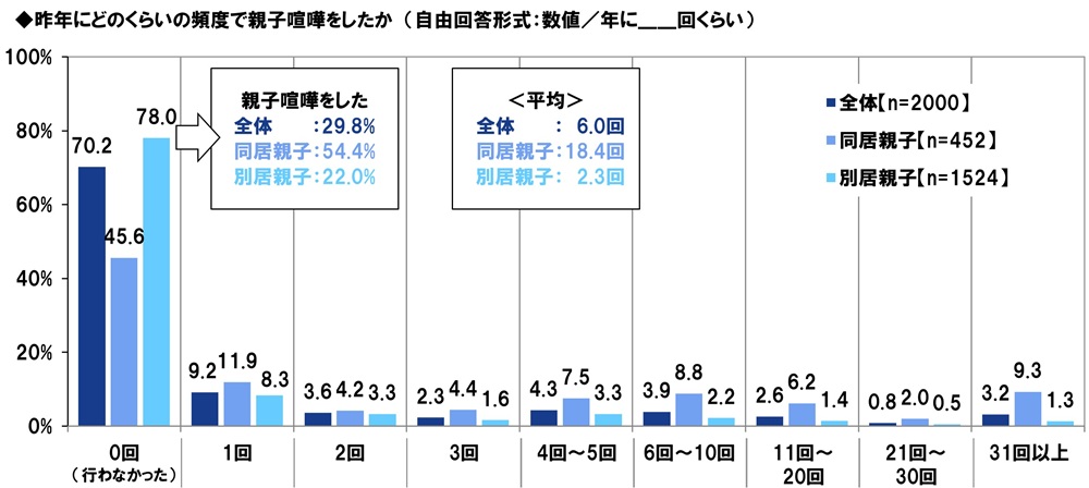 全回答者(2,000名)に、昨年にどのくらいの頻度で親子喧嘩したかを聞いたところ、平均は6.0回、「0回(行わなかった)」は70.2%となり、親子喧嘩をした人の割合は29.8%でした。