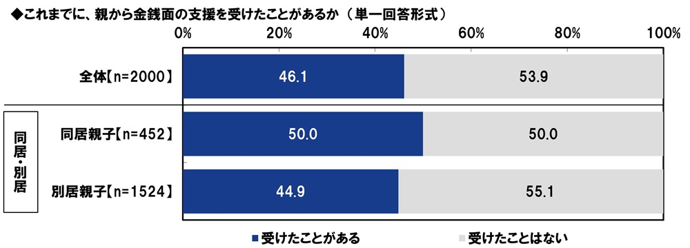 “親から金銭面の支援を受けたことがある人”は46%と、支援をしたことがある人の2倍に
