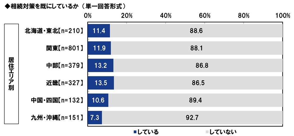 居住エリア別にみると、「知っている」は、相続対策を既にしている人と同様に、近畿(12.8%)が最も高くなり、中部(12.4%)が続きました。一方で、最も低くなったのは、中国・四国(3.8%)で、5%を下回りました。