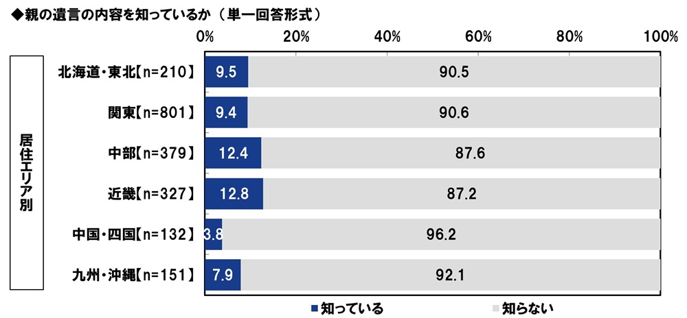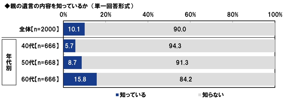 親の遺言の内容を知っているかを聞いたところ、「知っている」は10.1%、「知らない」は90.0%となりました。