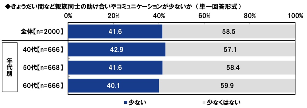 きょうだい間など親族同士の助け合いやコミュニケーションが少ないかを聞いたところ、「少ない」は41.6%、「少なくはない」は58.5%となりました。親族相互で声を掛け合ったり、協力したりする機会に乏しいと感じている人が少なくないようです。