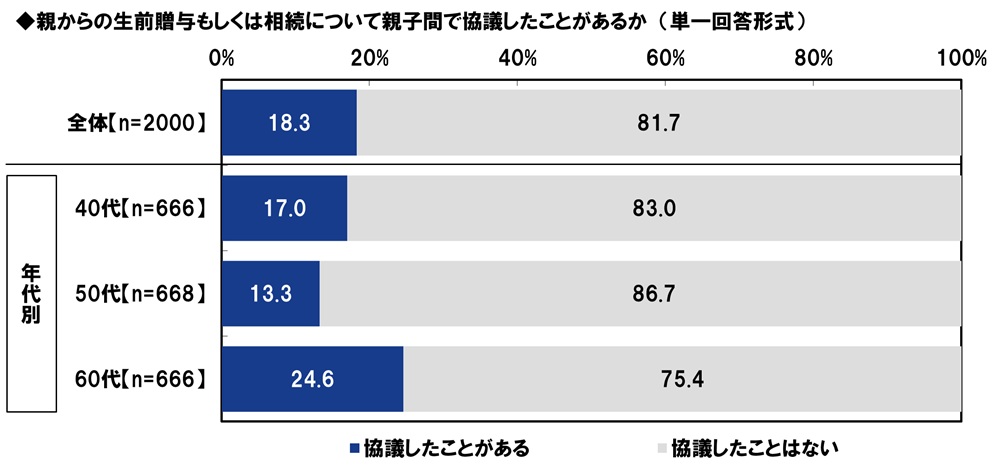 全回答者(2,000名)に、親からの生前贈与もしくは相続について親子間で協議したことがあるかを聞いたところ、「協議したことがある」は18.3%、「協議したことはない」は81.7%となりました。生前贈与や相続について親子で話し合った経験のある人は少数にとどまりました。