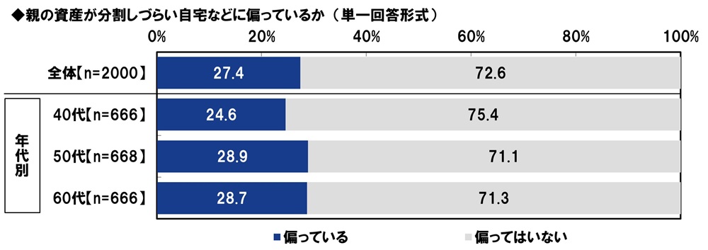 親の資産が分割しづらい自宅などに偏っているかを聞いたところ、「偏っている」は27.4%、「偏ってはいない」は72.6%となりました。