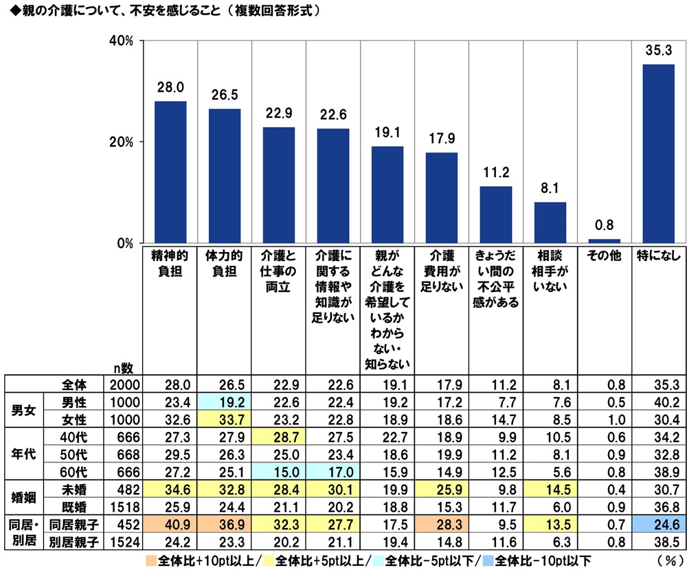 全回答者(2,000名)に、親の介護について、不安を感じることを聞いたところ、「精神的負担」(28.0%)が最も高くなり、「体力的負担」(26.5%)、「介護と仕事の両立」(22.9%)、「介護に関する情報や知識が足りない」(22.6%)、「親がどんな介護を希望しているかわからない・知らない」(19.1%)、「介護費用が足りない」(17.9%)が続きました。金銭面に対してよりも、心身への負担や仕事との両立、情報不足といったことに関して懸念している人のほうが多いようです。