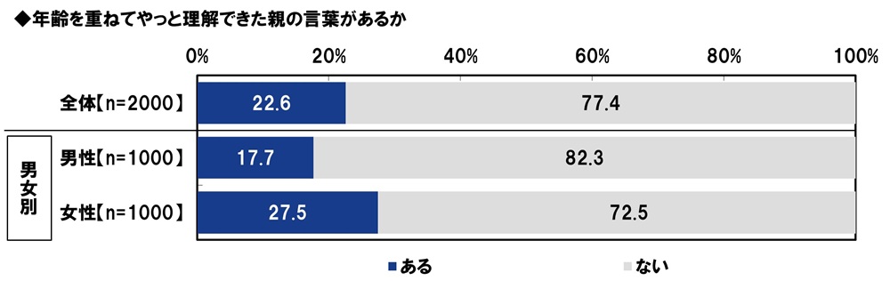 全回答者(2,000名)に、年齢を重ねてやっと理解できた親の言葉があるかを聞いたところ、「ある」は22.6%、「ない」は77.4%でした。