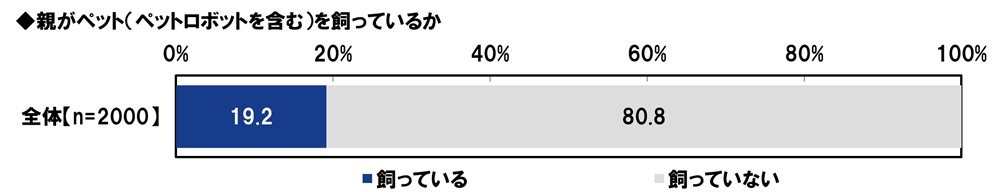 全回答者(2,000名)に、親がペット(ペットロボットを含む)を飼っているか聞いたところ、「飼っている」は19.2%、「飼っていない」は80.8%となりました。