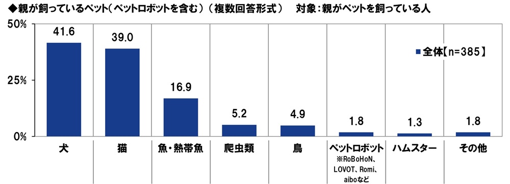 親がペットを飼っている人(385名)に、親が飼っているペットを聞いたところ、「犬」(41.6%)と「猫」(39.0%)が高くなり、「魚・熱帯魚」(16.9%)、「爬虫類」(5.2%)、「鳥」(4.9%)が続きました。