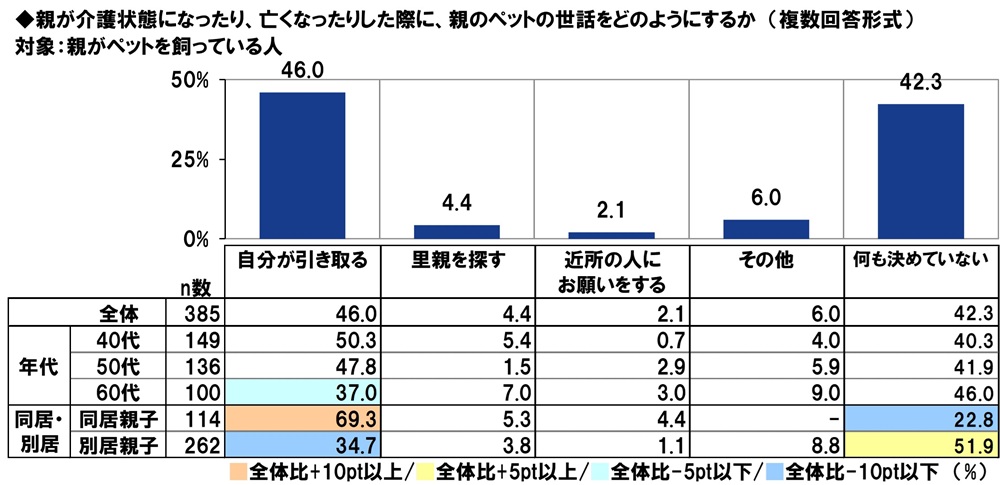 同居親子・別居親子についてみると、別居親子では「何も決めていない」(51.9%)が半数を超える結果となりました。親と別居している人の多くが、親がペットの世話をできなくなった際の問題について、検討を先送りにしている実状が明らかになりました。