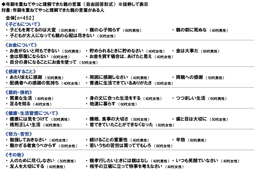 年齢を重ねてやっと理解できた親の言葉がある人(452名)に、年齢を重ねてやっと理解できた親の言葉を聞いたところ、「親の心子知らず(60代男性)」、「お金を貸す場合は、あげたと思え(40代女性)」、「普通に生活できているありがたさ(60代女性)」といった回答や、「身の丈に合った生活をする(40代女性)」、「睡眠、食事の大切さ(50代女性)」、「勉強しておきなさい(40代女性)」、「人のために尽くしなさい(50代男性)」、「親孝行したいときには親はなし(40代男性)」といった言葉が挙げられました。