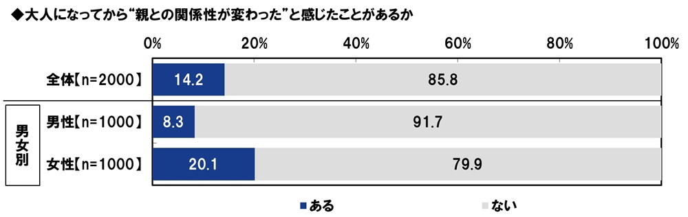 大人になってから“親との関係性が変わった”と感じたことがあるかを聞いたところ、「ある」は14.2%、「ない」は85.8%と、大半は関係性は変化していないと感じていることがわかりました。