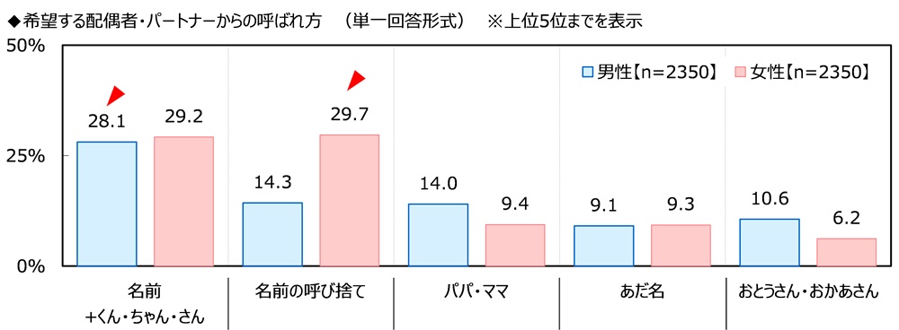 配偶者・パートナーからの希望の呼ばれ方 女性では「名前の呼び捨て」「名前+ちゃん・さん」がTOP2
