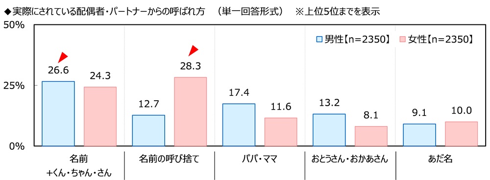 また、実際にされている配偶者・パートナーからの呼ばれ方を聞いたところ、男性では「名前+くん・さん」(26.6%)、女性では「名前の呼び捨て」(28.3%)が最も高く、男性・女性ともに“希望の呼ばれ方”と“実際の呼ばれ方”の1位が同じとなりました。
