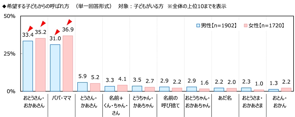 次に、子どもがいる方(3,622名)に、希望する子どもからの呼ばれ方を聞いたところ、男性では「おとうさん」(33.4%)、「パパ」(31.0%)が突出して高く、以降「とうさん」(5.9%)、「とうちゃん」(3.5%)、「名前+くん・さん」(3.3%)となりました。