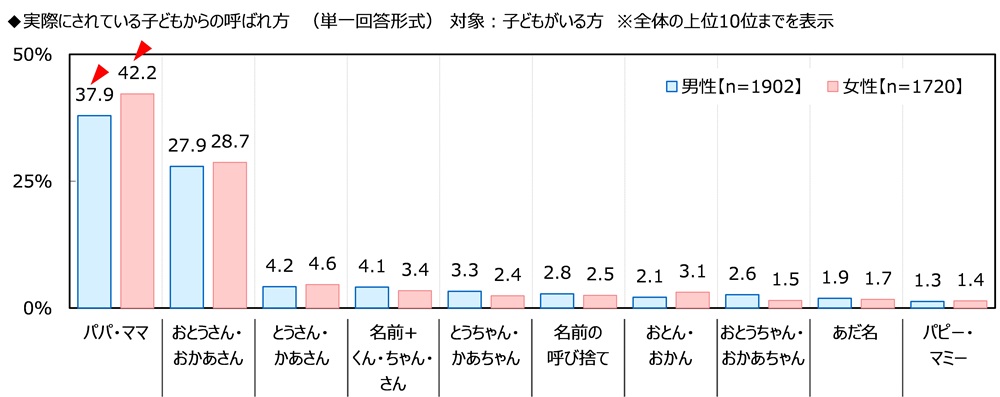 また、実際にされている子どもからの呼ばれ方を聞いたところ、男性では「パパ」(37.9%)が最も高く、次いで「おとうさん」(27.9%)、「とうさん」(4.2%)、「名前+くん・さん」(4.1%)、「とうちゃん」(3.3%)となりました。