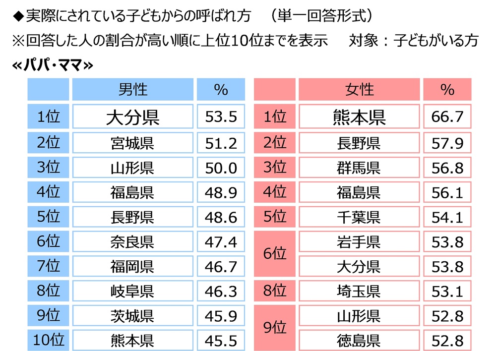 実際にされている子どもからの呼ばれ方のTOP2である「パパ・ママ」「おとうさん・おかあさん」について、それぞれ呼ばれている割合を都道府県別にみると、「パパ」が最も高くなったのは大分県(53.5%)で、宮城県(51.2%)、山形県(50.0%)が続き、「ママ」が最も高くなったのは熊本県(66.7%)で、長野県(57.9%)、群馬県(56.8%)が続きました。