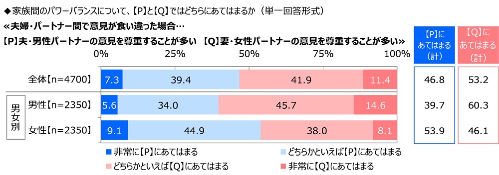 全回答者(4,700名)に、夫婦・パートナー間で意見が食い違った場合、夫と妻のどちらの意見を尊重することが多いか聞いたところ、『夫・男性パートナーの意見を尊重することが多い』(【P】にあてはまる(計):「非常に」と「どちらかといえば」の合計、以下同様)が46.8%、『妻・女性パートナーの意見を尊重することが多い』(【Q】にあてはまる(計):「非常に」と「どちらかといえば」の合計、以下同様)が53.2%となり、妻・女性パートナーの意見を尊重している夫婦・パートナーが多数派となりました。