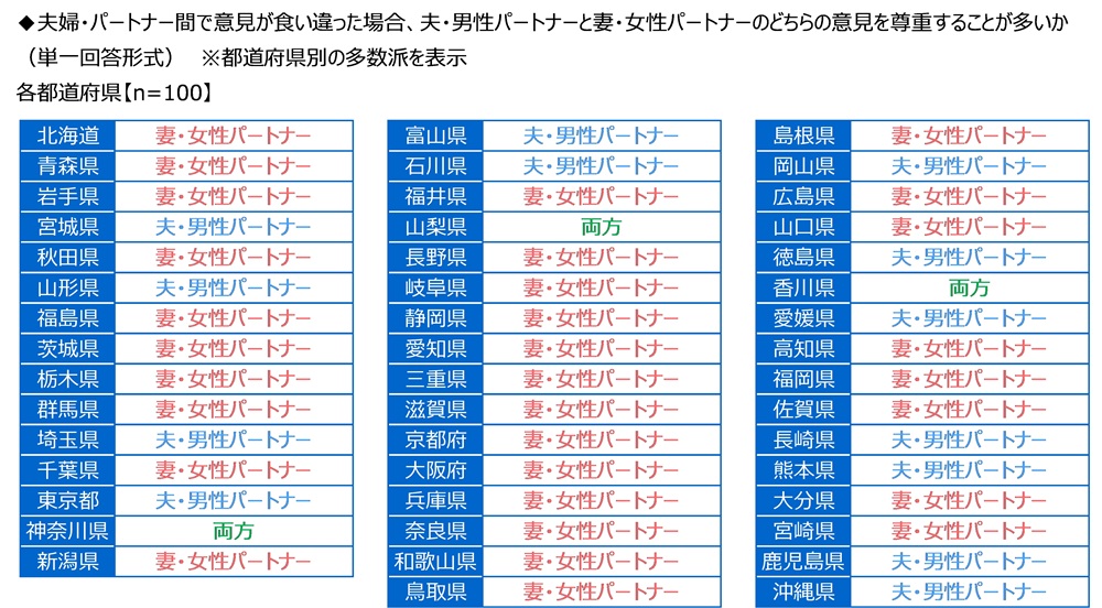 夫婦・パートナー間で意見が食い違った場合 「妻・女性パートナー」が多数派、