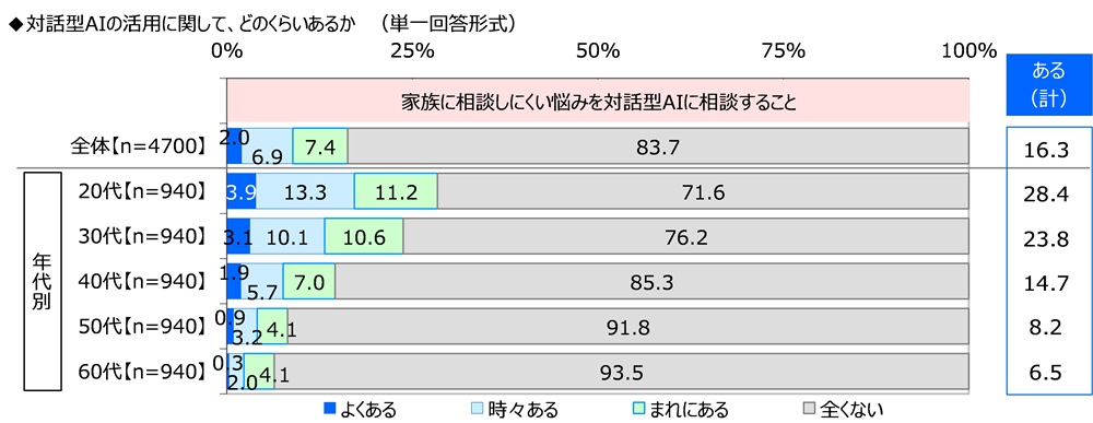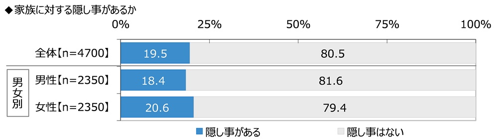 全回答者(4,700名)に、家族に対する隠し事があるか聞いたところ、「隠し事がある」は19.5%、「隠し事はない」は80.5%と、大多数が家族に隠し事はしていないことがわかりました。