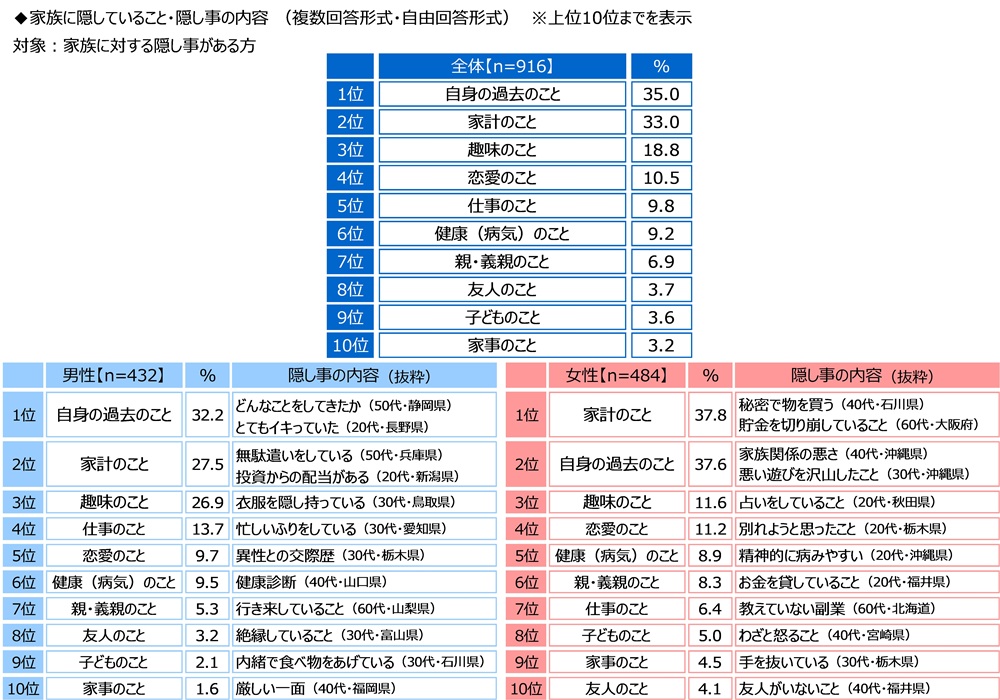隠し事の内容をみると、男性1位の「自身の過去のこと」では「どんなことをしてきたか」や「とてもイキっていた」、女性1位の「家計のこと」では「秘密で物を買う」や「貯金を切り崩していること」といった回答が挙げられました。