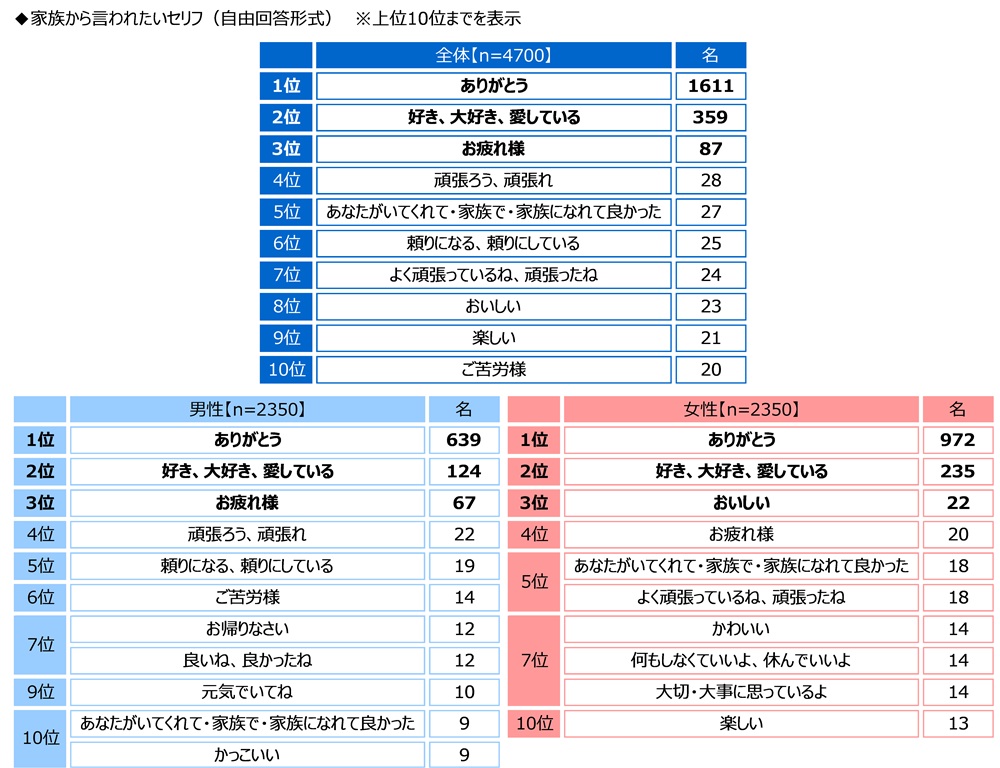 男女別にみると、言いたいセリフと同様に、男女とも1位は「ありがとう」(男性639名、女性972名)、2位は「好き、大好き、愛している」(男性124名、女性235名)となりました。また、男性では3位は「お疲れ様」(67名)、女性では3位は「おいしい」(22名)でした。