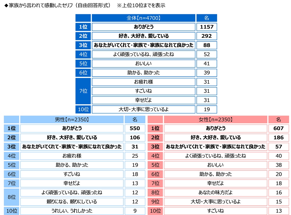 男女別にみると、男女ともに1位は「ありがとう」(男性550名、女性607名)、2位は「好き、大好き、愛している」(男性106名、女性186名)、3位は「あなたがいてくれて・家族で・家族になれて良かった」(男性31名、女性57名)となりました。